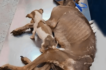 Pewnego popołudnia grupa podróżnych natrafiła na poruszający widok: matka‑pies i jej młode skulone obok