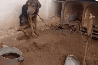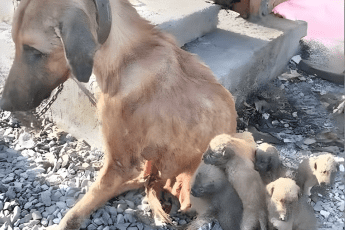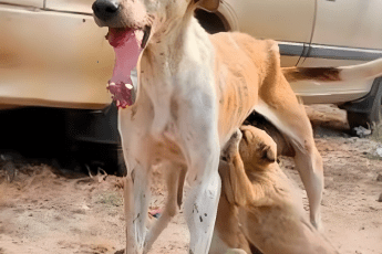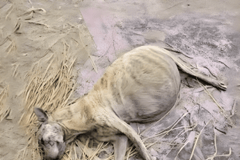 Na spękanej i wyschniętej ziemi spoczywała drobna suczka — prawie bez sil, wygłodzona po długiej tułaczce