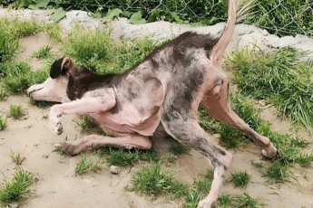 Na opuszczonym skrawku ziemi, pośród wyschniętej trawy, kulił się wychudzony pies — każdy jego krok był męką.