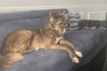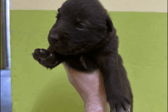 Szczenię stoi na zimnej posadzce, a cały jego mały świat skurczył się do cienkiego sznurka na szyi i