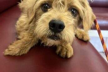 Szczeniak siedział przy siatce, jakby całym swoim drobnym ciałkiem chciał do niej przylgnąć.