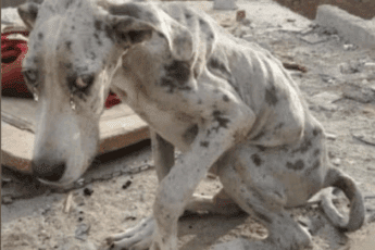 Siedział na zimnym betonie, chudy aż do kości, z gasnącymi oczami, z których płynęły prawdziwe łzy.