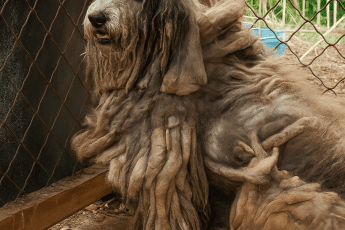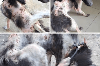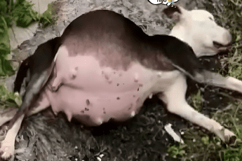 Am Wegesrand, erschöpft und mit einem aufgequollenen Bauch, lag eine Hündin – schwanger und fast ohne Kraft.