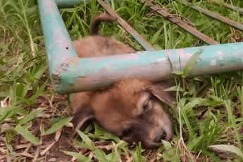 W zaroślach przy prywatnej posesji odkryto maleńkiego psa uwięzionego między prętami metalowego ogrodzenia