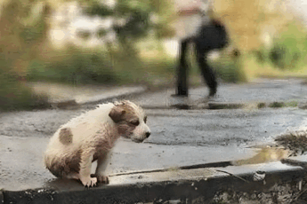 Na samym skraju chodnika leżał/siadał maleńki piesek — tak niewielki, że łatwo byłoby go przeoczyć.