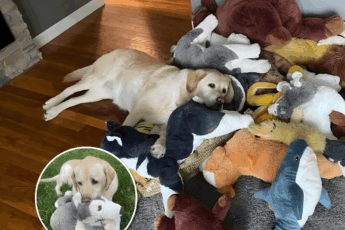 Suka, która codziennie wynosi na zewnątrz całą swoją kolekcję pluszaków Kilka lat temu właścicielka odkryła