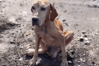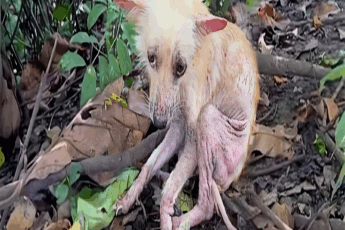 Przy hałdach śmieci, wśród zaniedbanych rumowisk, znaleziono psa w skrajnej niedoli — wychudzonego do