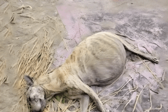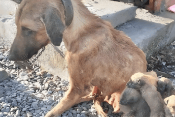 Na spękanej, wyschniętej ziemi leżała drobna suczka — niemal bez sił, wycieńczona brakiem pożywienia