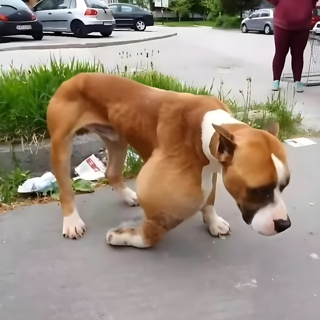 Znalezisko: młody przedstawiciel rasy American Staffordshire Terrier, który nie potrafił się poruszać. Widoczne obcięte uszy sugerowały, że kiedyś miał opiekuna — a mimo to został pozostawiony sam sobie. Mimo tragedii w oczach Alphonza wciąż tlił się wesoły charakter; merdanie ogonem i łagodna postawa nie zdradzały ogromu bólu, jaki musiał znosić.