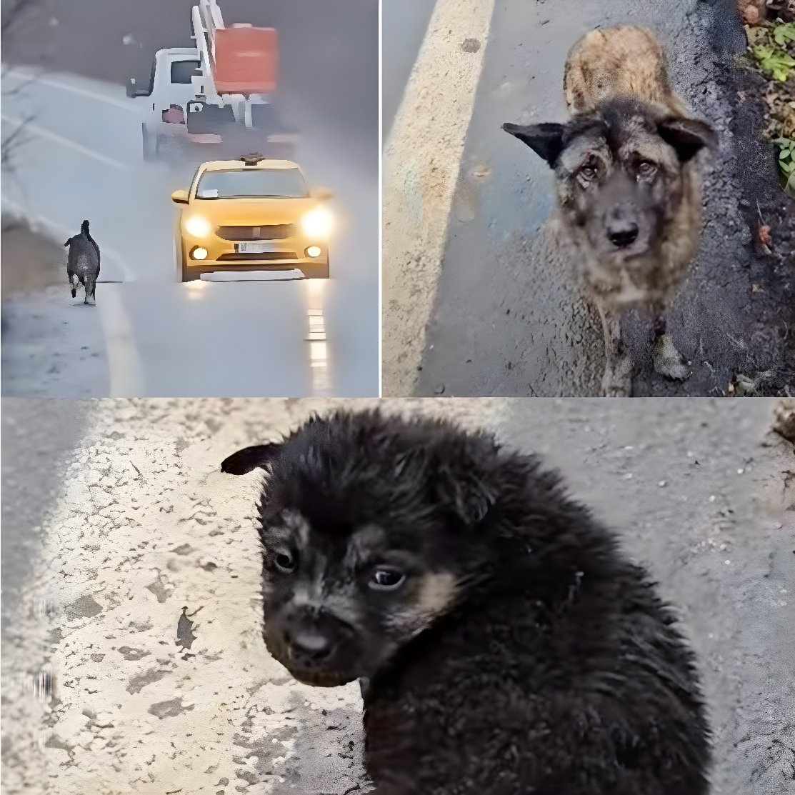 W przerażającym pośpiechu suczka przebiegała między pędzącymi autami, oczy pełne łez, desperacko szukając pomocy dla rannej rodziny — tak rozpoczęła się dramatyczna próba ocalić jej młode przed niebezpieczeństwem.