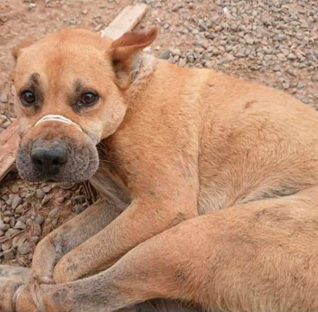 Łapy drżały ze zmęczenia. Prawie nie wstawał. Próbował — i zaraz padał z powrotem na kamienie. Ciało już się nie broniło, tylko powoli gasło. Sierść była skołtuniona, skóra popękana, oczy mętne. A sznur — ten symbol cierpienia — wciąż zbyt widoczny, zbyt wyraźny, jakby po to, by cały świat widział: oto pies, któremu odmówiono nawet prawa do oddechu.