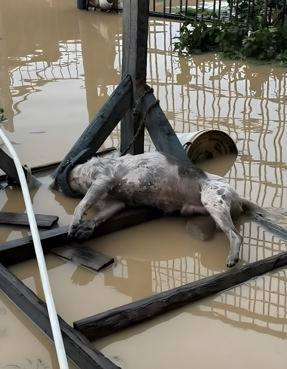 Wszystko zaczęło się, gdy Buster był przywiązany, jak to miał w zwyczaju, w momencie, gdy woda po raz pierwszy zaczęła sięgać ponad progi bramy ogrodowej. Jego opiekunowie, zaaferowani zabezpieczeniem wszystkiego, co mogli, źle zinterpretowali znaczenie Liny, sądząc, że to oferuje mu bezpieczeństwo w niepewnym świecie. Ale z każdą godziną, która mijała, poziom wody wzrastał, osiągając najpierw klatkę piersiową Bustera, a później jego ramiona, zmuszając go do wysiłku, aby utrzymać głowę ponad wirującą wodą. To, co kiedyś było mocnym drewnianym słupkiem, teraz stało się jego pułapką, uniemożliwiając mu wydostanie się w bezpieczne miejsce. Frustracja i paniczne szczekanie ustąpiły miejsca cichym jękom., wyrażając nagląca sprawa, jaką stała się jego walka o utrzymanie się na powierzchni. Z każdą chwilą zmęczenie zaczynało go przytłaczać, a jego mokra skóra stała się dodatkowym balastem.