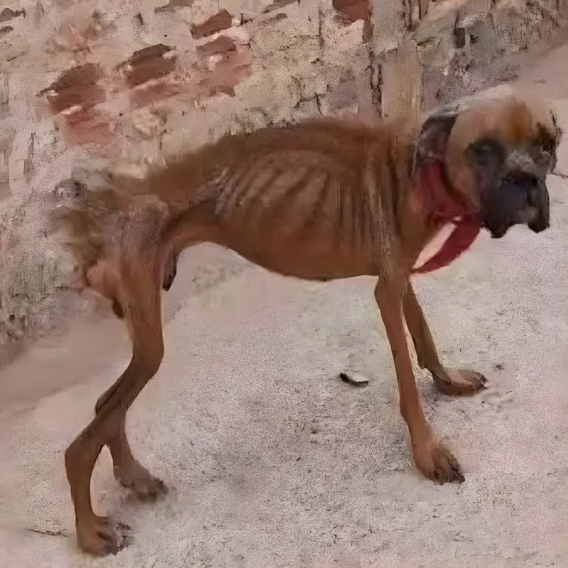 Echo czyichś kroków sprowadziło mnie do niego — to nie był przypadek. W wąskiej uliczce, gdzie powietrze smakowało stęchłą cegłą i resztkami dymu z zeszłego roku, panował tak głęboki spokój, jakby kamienice wstydziły się patrzeć sobie w oczy. Stał tam, podtrzymując postawę siłą woli, nie kości: żeberka rysowały cienie, brzuch zwisał papierowy i łamliwy, a na szyi błyszczała czerwona obroża — paradny akcent na tle zaniedbania.