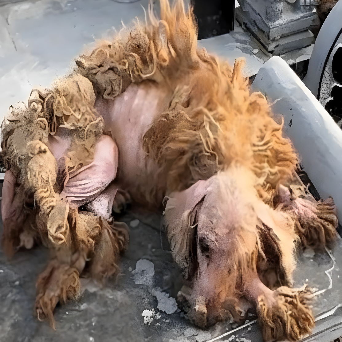 Znalazłem go na płaskim dachu targowiska — miejscu, gdzie rzadko zapuszczają się przypadkowi przechodnie: drabina chybotliwa, wiatr nosi zapach rdzy i cudzych historii schowanych pod brezentowymi straganami. Leżał na betonowej płycie, skulony jakby chciał ukryć łapy przed pamięcią; rude futro sklejone w sztywne kołtuny przypominało zaschniętą pianę morską, skóra pod nimi była różowa i naga, na szyi widniał ślad ciasnego sznura. Oczy — bardzo ciemne — śledziły moje ręce; ich spojrzenie było jak spojrzenie kogoś, kto zbyt wcześnie poznał reguły i już nie bierze udziału w rozgrywce, tylko czeka, żeby odejść. Usiadłem, położyłem obok kurtkę, żeby wiatr nie dmuchał mu w pysk i szepnąłem ludzkie imię — Sam — wtedy uszy ledwo zadrgały, jakby to słowo trafiło w jakąś zapisaną zimami pamięć.