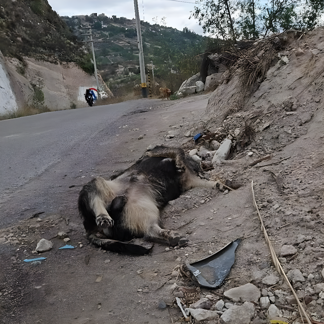 Na ruchliwej drodze, gdzie silniki wyrzucały fale hałasu, a kurz unosił się niczym niewidzialna zasłona, prawie nikt nie zauważał leżącej tam istoty. Skurczone ciało, wychudzone i osłabione, skulone między odłamkami i brudem, wyglądało, jakby ostatnie tchnienie było dla niego trudem nie do przezwyciężenia. Łapy nie miały już siły, oczy pogrążyły się w półmroku spowodowanym głodem i bólem — i zdawało się, że jedyną możliwą końcówką jest samotność przy poboczu.