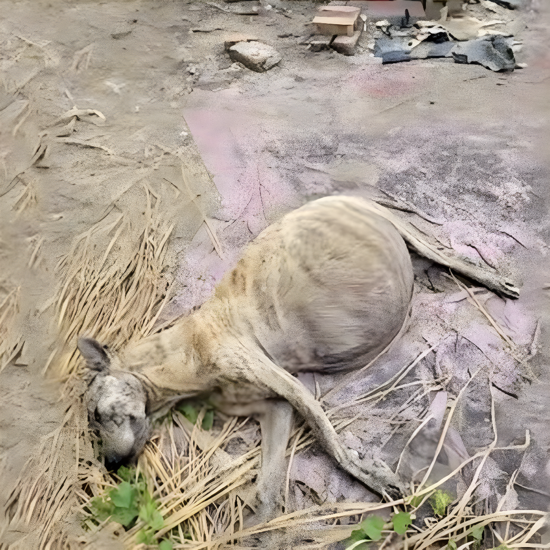 Na spękanej, wyschniętej ziemi leżała drobna suczka — niemal bez sił, wycieńczona brakiem pożywienia i długą wędrówką. Jej znacznie powiększony brzuch zdradzał, że nosiła pod swoim sercem nowe życie. Choć oddechy były płytkie i wolne, w zachowaniu zwierzęcia widoczny był nieugięty instynkt: ochrona potomstwa była ważniejsza niż troska o własne przetrwanie.