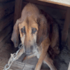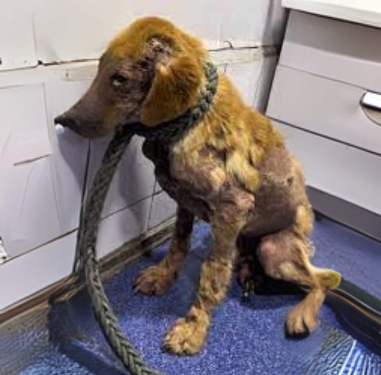 Он сидел в углу, уставившись в стену, словно пытаясь стать невидимым. Лапы были поджаты, тело худое, местами без шерсти. Вокруг шеи у него была обмотана толстая, грубая верёвка, натянутая так туго, что, казалось, вот-вот она навсегда застрянет у него в горле.
