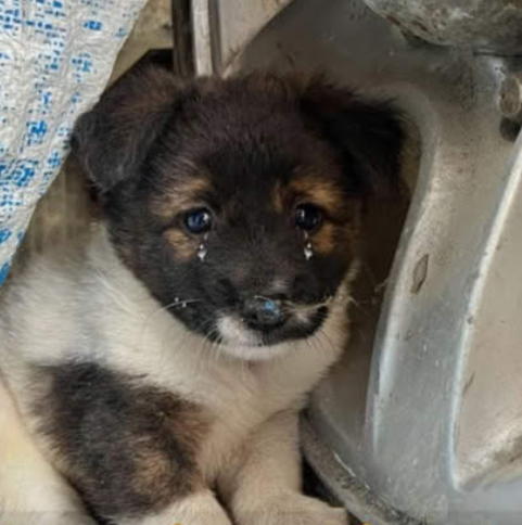 Siedział pomiędzy zardzewiałym kołem a starymi workami, jakby chciał zniknąć, rozpłynąć się w powietrzu, żeby nikt więcej go nie zobaczył. Jego sierść była brudna, skołtuniona, na nosie — ślady kurzu, a w oczach stały łzy, tak ciężkie dla szczeniaka, że wydawały się większe od niego samego. Nie skomlał, nie szczekał, tylko patrzył. A w tym spojrzeniu było wszystko: strach, samotność, głód i rozpacz.