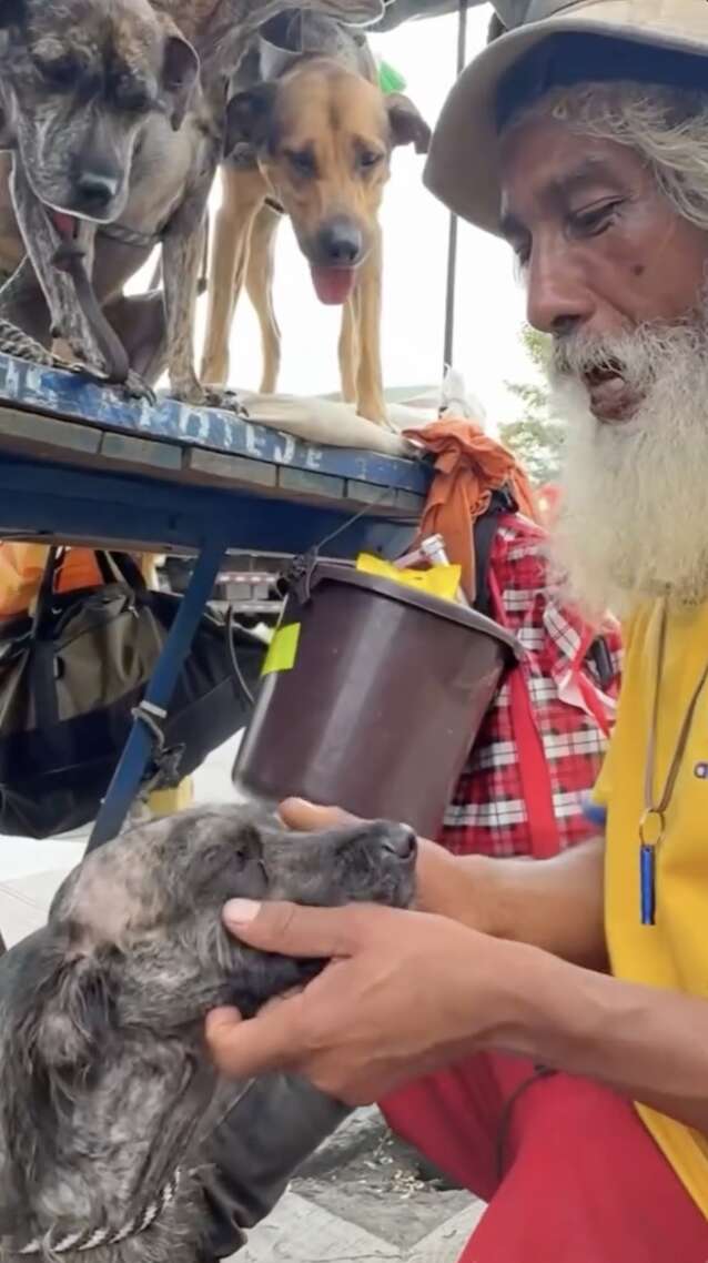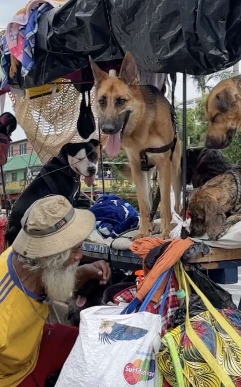 Bezdomny opiekun z wielkim sercem: Noé nie robi selekcji — przygarnia psy w różnym wieku i stanie zdrowia. Początek tej historii to jeden uratowany pies, a teraz jego „rodzina” jest tak liczna, że przewozi ją dwupoziomowym wózkiem na kółkach.