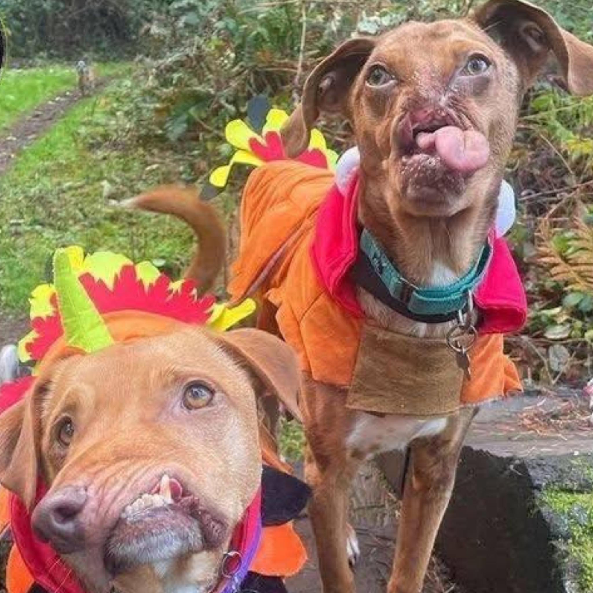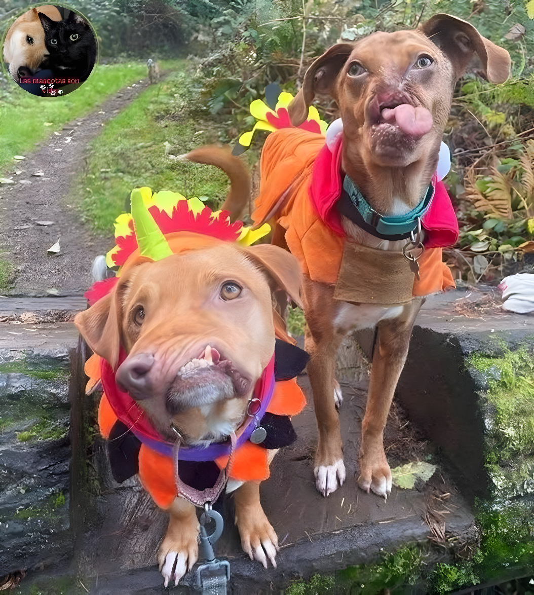 Nie planowałam dziś rozpisywać się długo. Zdjęcie jednak poprosiło o więcej słów — żeby dało się usłyszeć to, czego nie uchwycono obiektywem. Na fotografii wesołe przebrania dinozaurów, kolorowe „grzebienie” i dwa psy, które większość potraktuje jak zabawny kadr. A ja widzę zimne schody przy leśnej skarpie poza miastem, gdzie ich znaleziono: Kirę — czujną, o przenikliwym spojrzeniu, i Maka — rudego, okrągłego, jakby cały czas przepraszał, że zbyt hałaśliwie oddycha. Obaj urodzili się z cechami twarzy: asymetrią, szczeliną w wardze, językiem, który żyje własnym życiem. Na zdjęciu trwa święto. A wcześniej były mróz, strach i dwoje zwierzchów przytulonych, by się nie rozpaść.