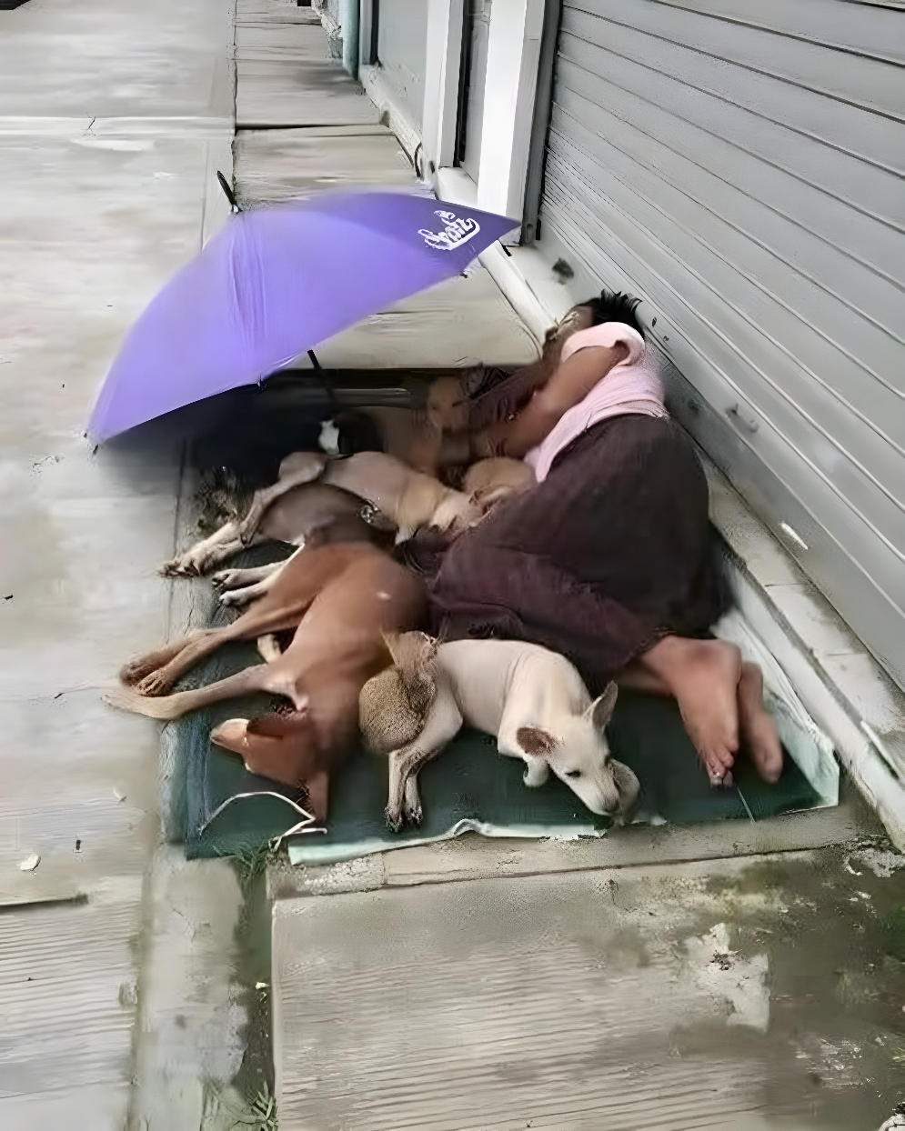 Przechodnie wielokrotnie widują ją przy krawężniku: w pozycji osłony obwiązującej cienkie ciało swoimi ramionami, otaczając futrzane stworzenia ciepłem i chroniąc przed chłodem. Zamiast odpędzać zwierzęta, traktuje je jak bliskich — karmi okruchami, które zebrała, głaszcze i strzeże, gdy życie na ulicy staje się szczególnie surowe.