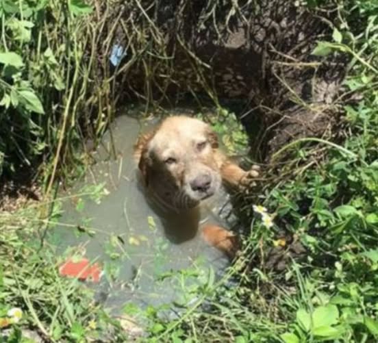 Natrafiłem na niego przypadkiem. Przechodziłem obok i usłyszałem nietypowy plusk. Początkowo myślałem, że to ptak lub żaba. Kiedy zajrzałem — widok złamał mi serce: w wodzie stał pies. Nie wył, nie skomlał; patrzył. W jego oczach kryło się zmęczenie, ale także ledwo tlące się oczekiwanie pomocy.