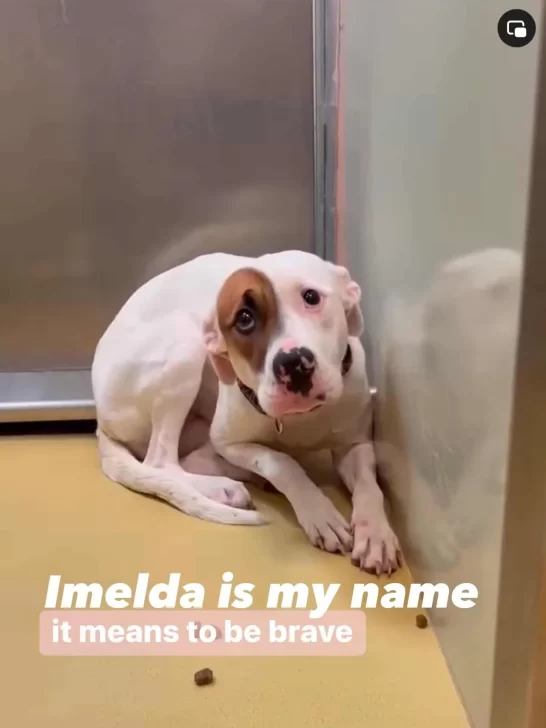 Nie sposób w pełni odczytać lęku, który wypełniał serce Imeldy w dniu, gdy wykonano zdjęcie. Znajdowała się w ciasnej klatce schroniska w Kansas — zdezorientowana, trzęsąca się i szukająca choćby niewielkiej przystani przy ścianie. Wokół rozlegały się przenikliwe dźwięki innych boksów, które tylko pogłębiały jej panikę.