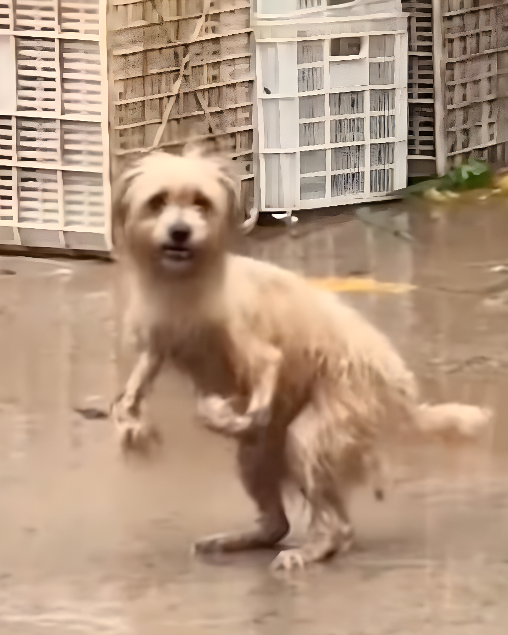 Однажды в дождливый день, стоя под навесом, один мужчина заметил движение на другой стороне улицы, которое привлекло его внимание. Он увидел маленькую собаку, которая с трудом пыталась передвигаться, ее мокрая шерсть тряслась от холода. То, как собака пыталась идти, было особенно печальным: ее передние лапы были серьёзно деформированы, согнуты внутрь, что заставляло её балансировать на задних лапах и тащить остальное тело за собой. Каждый шаг давался с трудом и вызывал явную боль, но собака продолжала идти, полная решимости найти укрытие в этом холодном мире.
