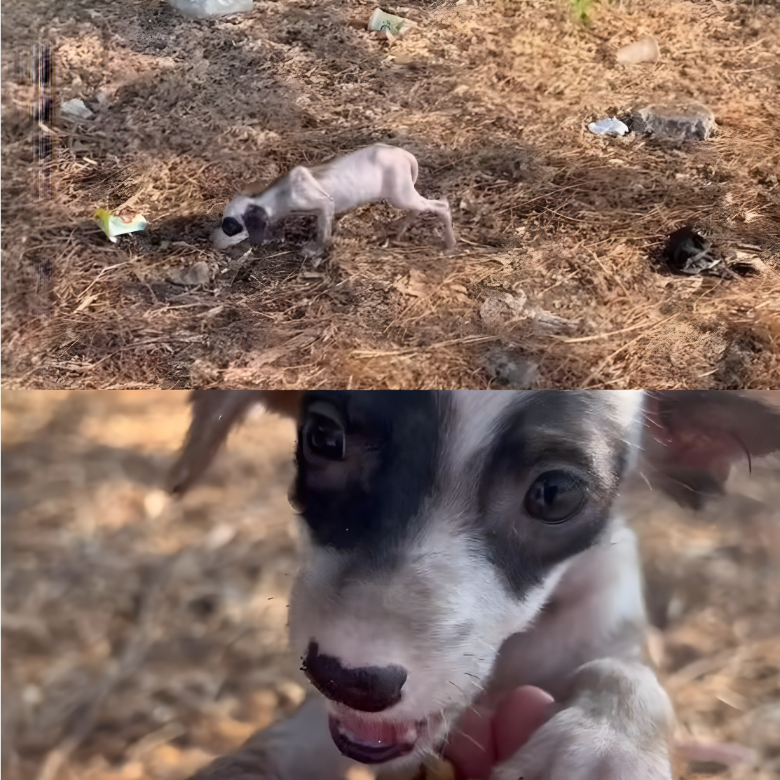 Uklęknął przy niej i przytulił — maluch wtulił się w jego ramiona, szukając bezpieczeństwa. Jego ciało było wychudzone, żebra wyłaniały się spod matowej, zabrudzonej sierści; natychmiast stało się jasne, że potrzebuje natychmiastowej pomocy i wszechstronnej opieki.