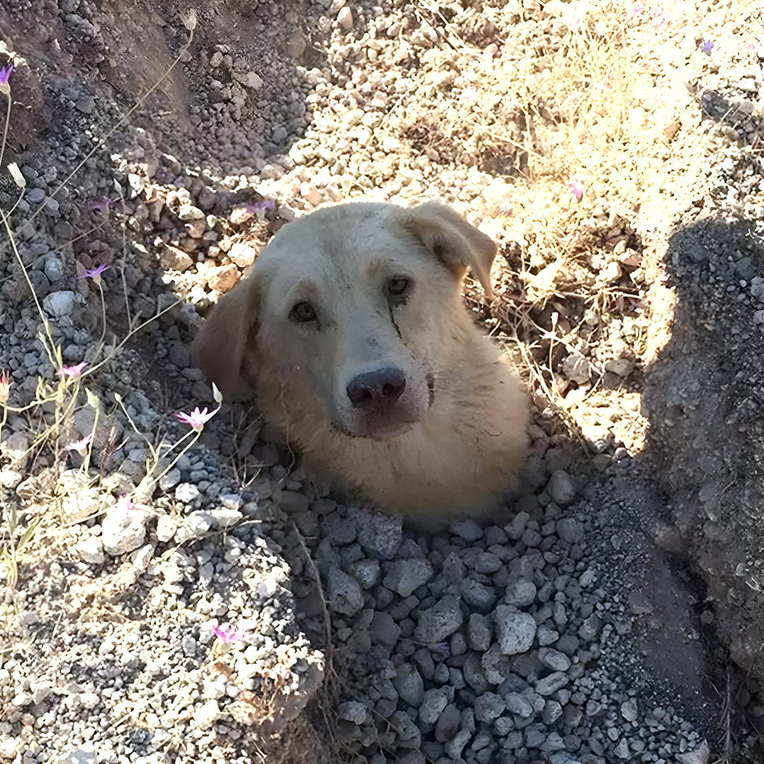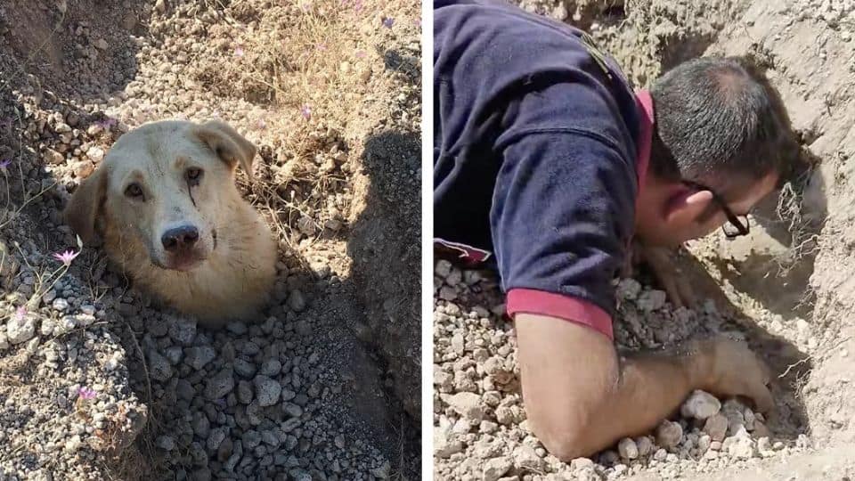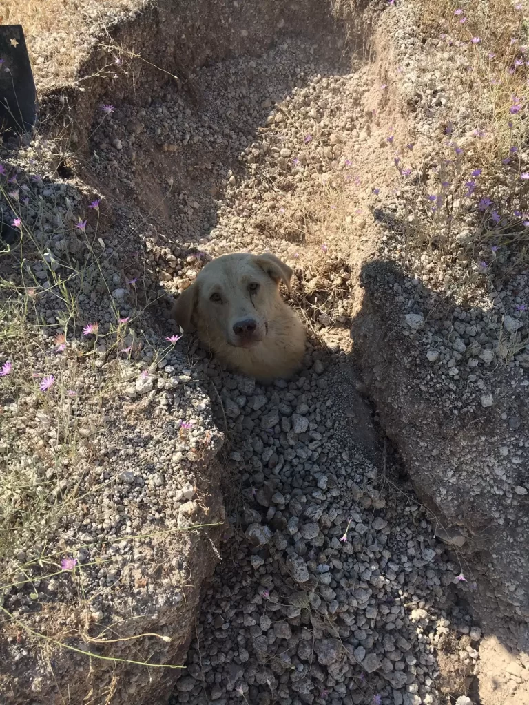 Przez chwilę Soner stał bez słowa — obraz był przygnębiający. Pies musiał od dawna znajdować się pod ziemią; twarz zdradzała zmęczenie, ale w jej spojrzeniu kryła się jeszcze determinacja. Mężczyzna wiedział, że nie może odejść. Pobiegł po łopatę i wrócił, gotów zacząć wyciągać ziemię z miejsca, w którym zwierzę utknęło.