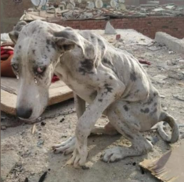 Na obrzeżach miasta, wśród opuszczonych budynków, gdzie wiatr świstał w szczelinach zardzewiałych płotów, siedział on. Pies, którego życie zamieniło w cień. Jego ciało przypominało szkielet obciągnięty skórą, sierść zwisała kępami, łapy drżały. Na pysku zastygło wyrażenie zmęczenia, a w oczach błyszczały krople podobne do łez.