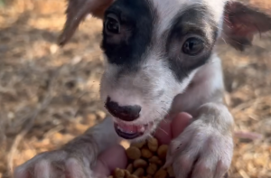 Nie mógł zostawić jej na pastwę losu. Przeszukał worek z rzeczami, które miał przy sobie, znalazł jedzenie i podał je psu — zwierzę pochłonęło je natychmiast, a każdy kęs był wyrazem ulgi i wdzięczności. Widząc, że głód jest realny, mężczyzna dodał jeszcze kilka porcji, żeby nasycić małe, wyniszczone ciało.