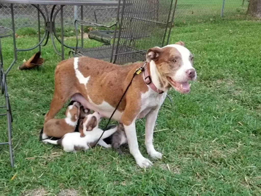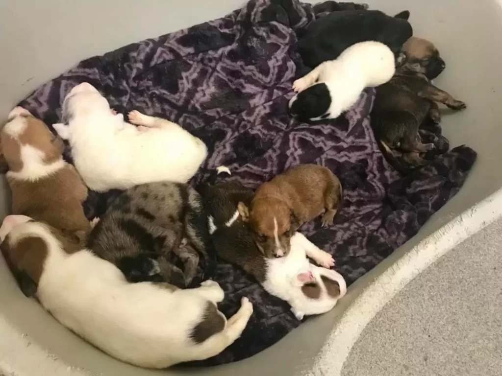 Gdy pracownicy schroniska w Teksasie zobaczyli Melody po raz pierwszy, natychmiast wyczuli, że coś jest nie tak. Jej sylwetka była skrajnie wychudzona — żebra widoczne jak rysunek — a mimo to przytulała do siebie grupę maleńkich szczeniąt: dziesięcioro potomstwa, pozostawionego razem z matką bez żadnego wyjaśnienia.