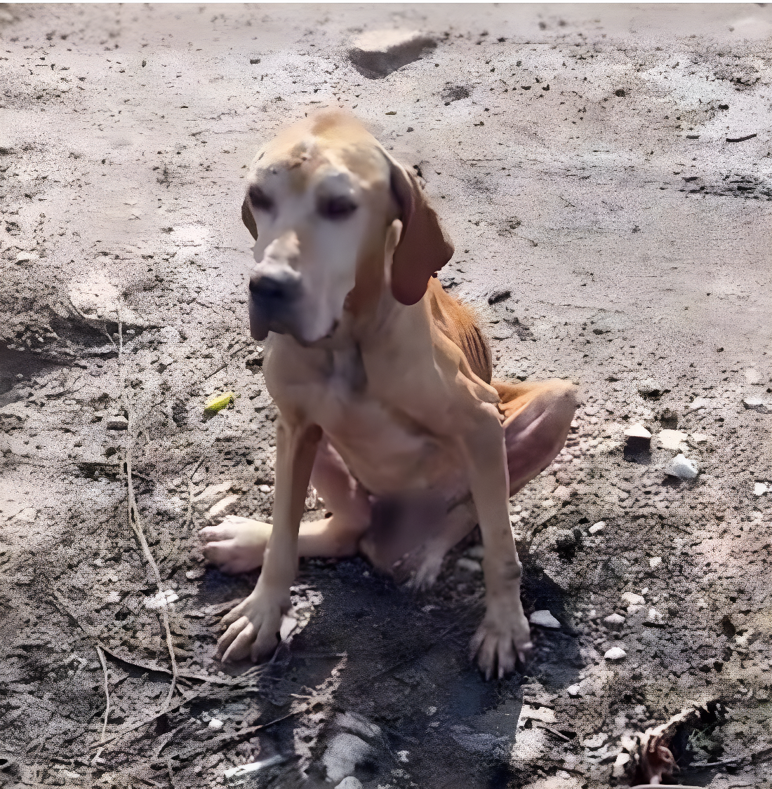 Przy hałdach śmieci, wśród zaniedbanych rumowisk, znaleziono psa w skrajnej niedoli — wychudzonego do granic, z wyraźnie widocznymi żebrami i błagalnym spojrzeniem. Ten fragment rzeczywistości działał niczym głośny krzyk o pomoc, który wypełnił dookoła ciszę porzuconego miejsca.