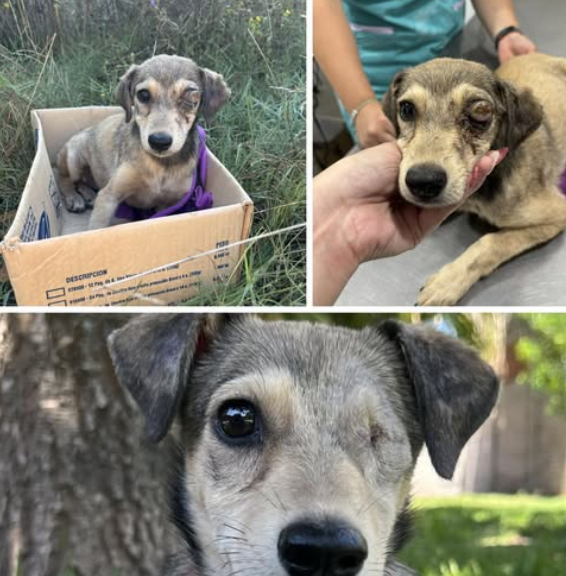 Kiedy zajrzeliśmy, zobaczyliśmy jedno ogromne oko, zbyt dorosłe jak na szczeniaka. Drugiego już nie było — tylko stary, nierówny bliznowaty ślad. Maluch leżał, wtulony nosem w mokry karton, nie szczekał, nie próbował uciekać. Oddychał krótko, rwąco, jakby każdy wdech trzeba było przeciskać przez wąską szyjkę butelki. A jednak każdy z tych oddechów mówił: „Żyję. Jeszcze tu jestem”.