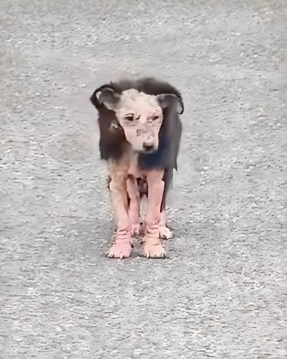 Mężczyzna, prowadząc samochód po wiejskiej drodze, nagle dostrzegł samotnego psa, który stał w samym środku jezdni. Wyglądał na zagubionego i wyczerpanego, co przykuło jego uwagę. Niestety, nie wyglądał na zdrowego – jego ciało było pokryte otwartymi ranami i łysymi plamami, które były rezultatem zaawansowanego stadium świerzbu. Infekcja, która rozprzestrzeniła się na jego pyszczku, nogach i grzbiecie, ujawniała obdartą, zapalną skórę.