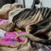 Przy ścianie, tuż obok krawężnika, zwinięty w niewielki kłębek, siedział szczeniak. Był naprawdę malutki. Jego mokra sierść przylegała do chudego ciałka, łapki drżały, ogonek był podgięty maksymalnie. Nie skomlał. Nawet nie szczekał. Po prostu siedział. I opuścił głowę, jakby prosił: „Tylko mnie nie bij…”