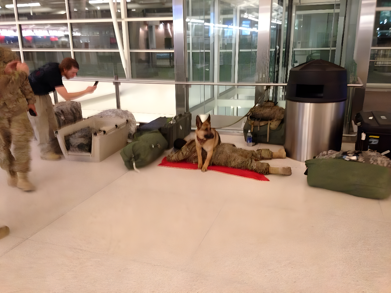 Zdjęcia pokazują zgraną grupę: dziesięciu żołnierzy i dwa psy odpoczywają na lotnisku. Walizki wokół sugerują długą podróż — czy to powrót do domu, czy przystanek w trakcie misji, nie jest jasne. Mimo zmęczenia i chwilowego odpuszczenia, strażnik nie zrezygnował z czujności.
