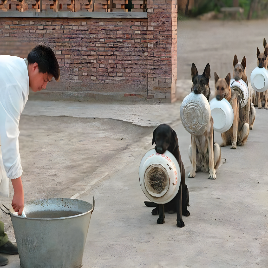 Na poniższym zdjęciu widzimy szereg psów trzymających miski w pyskach — obraz, który uderza spokojem i perfekcyjną organizacją. To ujęcie pochodzi z chińskiej szkoły tresury psów policyjnych i może skłaniać do refleksji nad tym, jak wiele możemy wyciągnąć z ich zachowania.