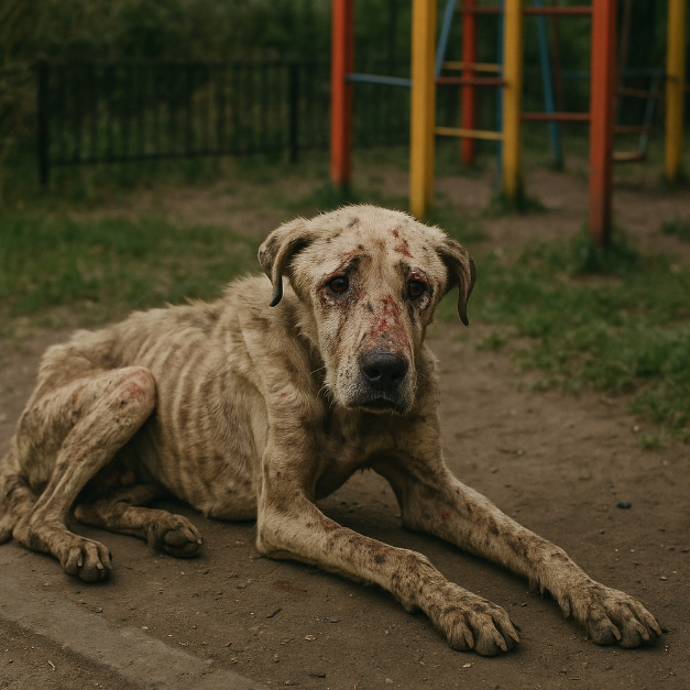 Leżał na ziemi, tuż obok obdrapanych huśtawek, jakby sam stał się częścią tego opuszczonego miejsca. Skóra napięta na kościach, sierść w strzępach, brudna i wyblakła, a w oczach ten rodzaj spojrzenia, od którego chce się odwrócić wzrok, choć nie można. To był wzrok istoty, której zabrano wszystko — siłę, nadzieję, nawet prawo do zwykłego życia.