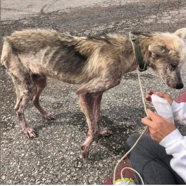Stał na drodze, chwiejąc się z wycieńczenia. Jego ciało było jednym wielkim żebrem, skóra zwisała fałdami, a łapy drżały tak, jakby w każdej chwili mogły się pod nim ugiąć.