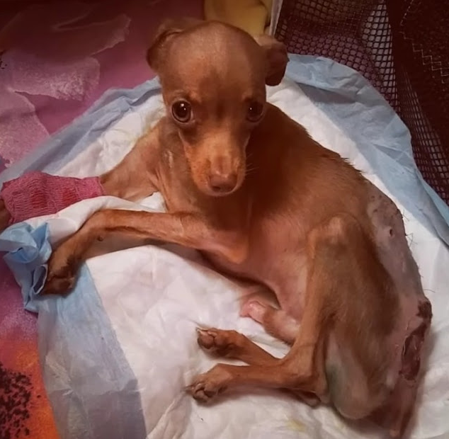 Pea ma zaledwie osiem miesięcy i waży około 2,1 kg — jego życie powinno być pełne zabawy i ciepła. Zamiast tego doznał brutalnego ataku ze strony większych psów: złamany kręgosłup, paraliżujący uraz i śmiertelnie poważne rokowania zmieniły jego codzienność w walkę o przetrwanie.