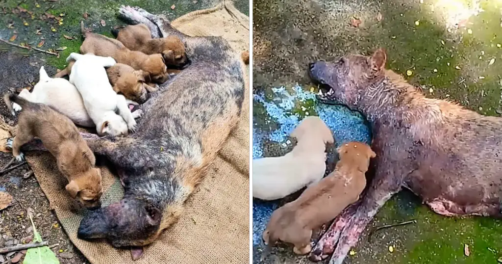 Przechodząca osoba o wrażliwym sercu nie przeszła obojętnie. Widok był przytłaczający — matka tak wyniszczona, że nie potrafiła nawet unieść głowy, a mimo to próby karmienia swojego miotu trwały bez ustanku.
