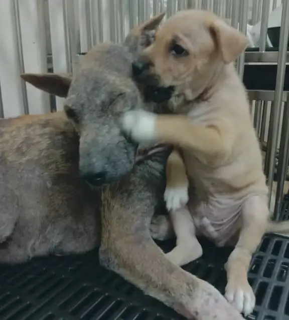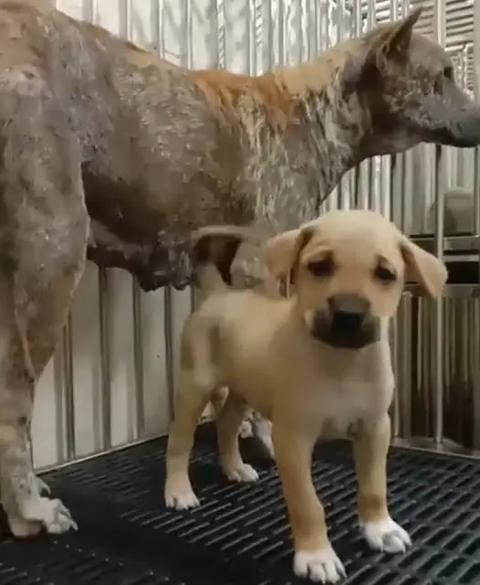 Kiedy ratownicy dotarli na miejsce, wiedzieli, że każda minuta ma znaczenie. Matka była odwodniona i wycieńczona do granic możliwości — jej organy dawały wyraźne sygnały osłabienia. Zapakowali ją z szczeniętami i pośpiesznie przewieźli do kliniki weterynaryjnej.