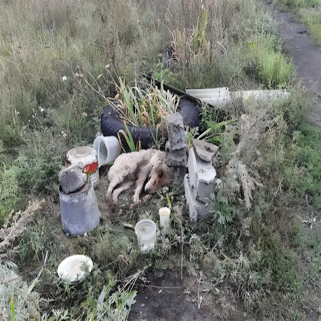 Kiedy Svetlana usłyszała alarmujące zgłoszenie, natychmiast udała się na wiejską drogę, by sprawdzić, czy ktoś potrzebuje pomocy. Z daleka dostrzegła leżącego psa — okazało się, że to Bunny: stary, osłabiony czworonóg porzucony przez opiekuna wyłącznie z powodu wieku. Leżał nieruchomo między dachówkami i kamieniami, niemal całkowicie poddany swojemu losowi.