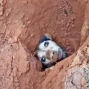 W czerwonej ziemi wystawały jedynie przerażone oczy — maleńki skrawek życia, który walczył z przytłaczającą ciemnością. Ciało zwierzęcia było niemal całkowicie przykryte, drżące od wysiłku, jakby każdy oddech był prośbą wyszeptaną w nadziei, że ktoś usłyszy. Ziemia zdawała się skazywać je na zniknięcie, ale w spojrzeniu pozostała iskra pragnienia: biec, czuć dotyk, znów być kochanym.