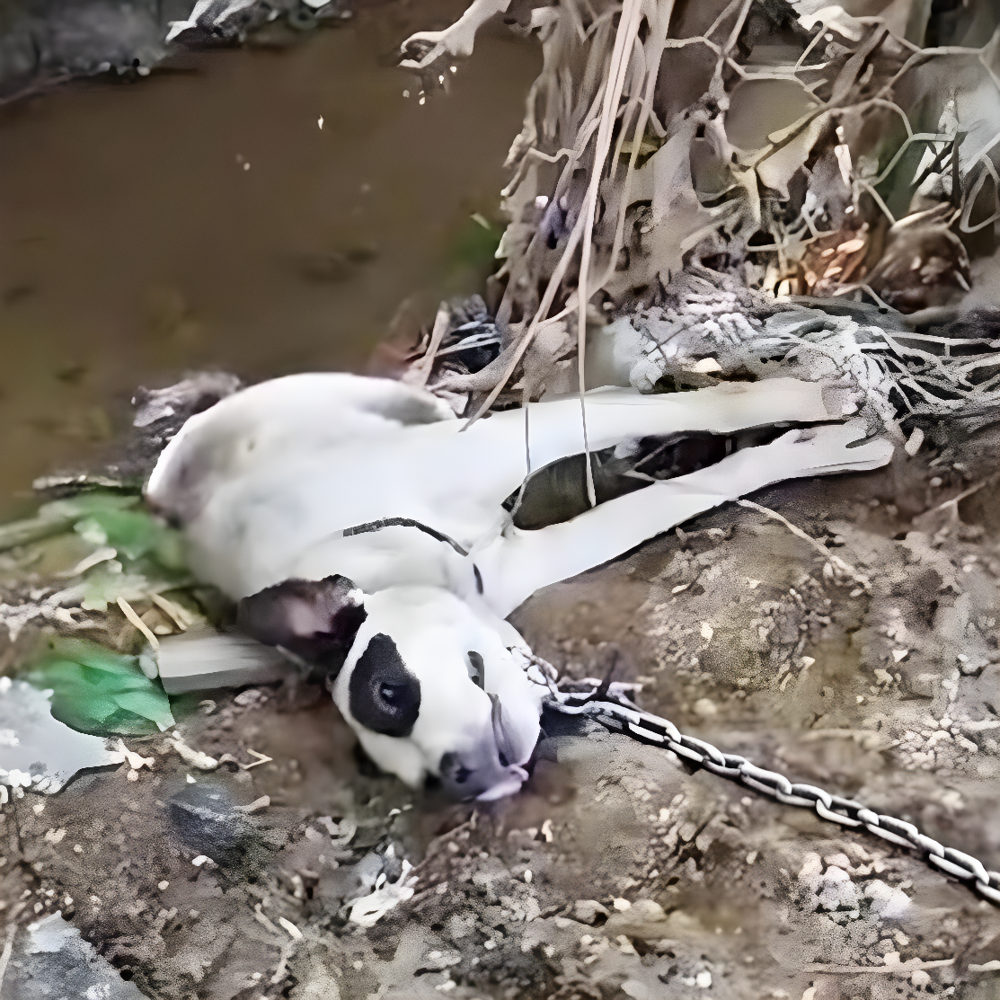 Leżał przy cichej rowie, zapadnięty w cieniu, unieruchomiony przez ciężkie łańcuchy. To krępujące pętanie pozostało po kimś bezwzględnym — ktoś zostawił go samemu sobie, skazując na odosobnienie i cierpienie.