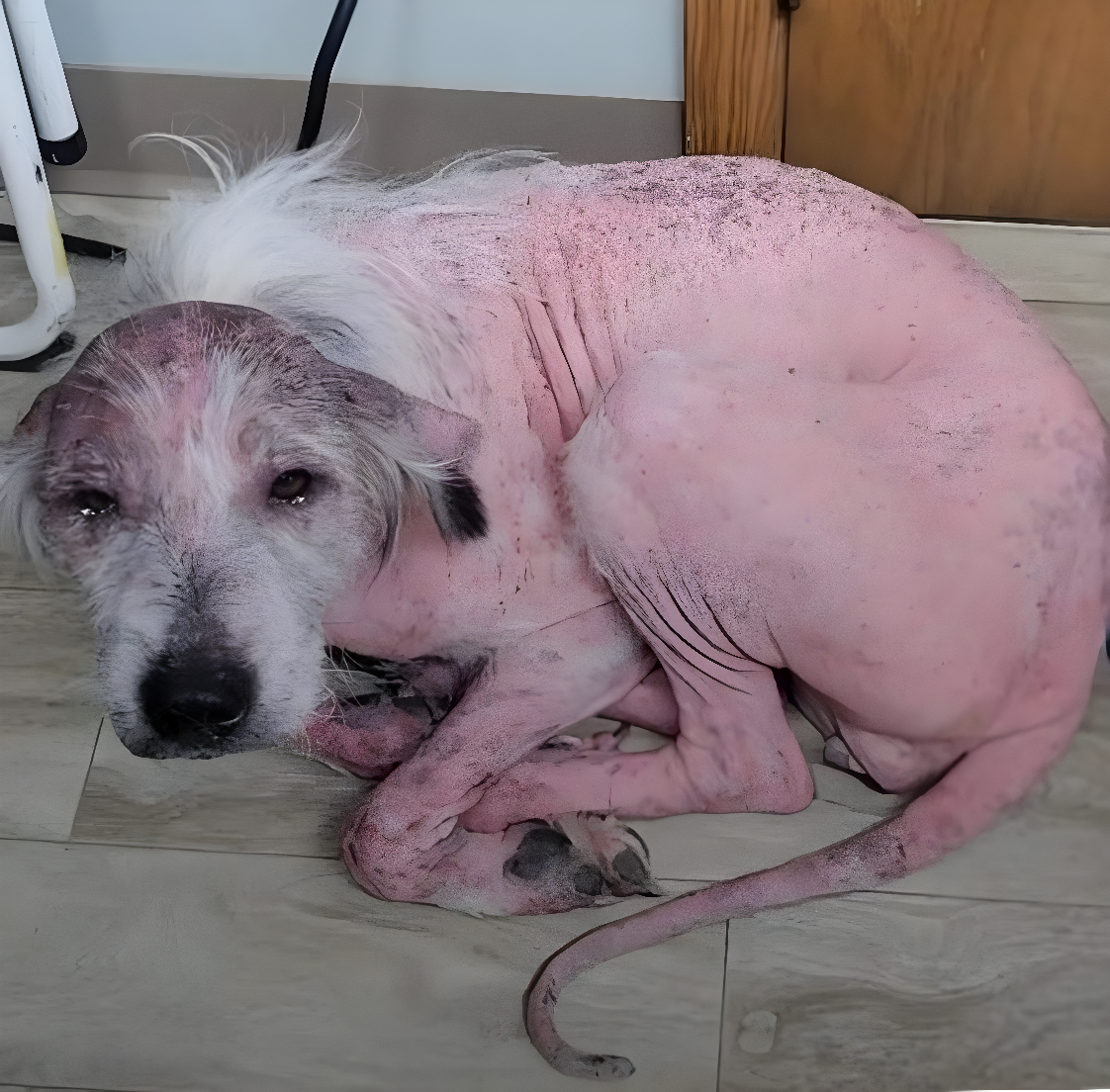 Jego skóra przypominała dawny obraz oparzenia: różowe odcienie, pęknięcia, a lokalnie otoczone strupami. Dawniej cieszył się piękną, gęstą, białą sierścią, która była miękka i przyjemna w dotyku, ale niestety skarcił go los, a jego silny, choć delikatny pancerz został odebrany przez nieuchronne choroby oraz wszechobecny głód. Pozostały zaledwie resztki włosów na głowie i ogonie — marne wspomnienie minionego życia. Z niezrozumiałego powodu drżał nawet w ciągu upalnego dnia; jego siły nie mogły już dłużej znieść trudów istnienia.