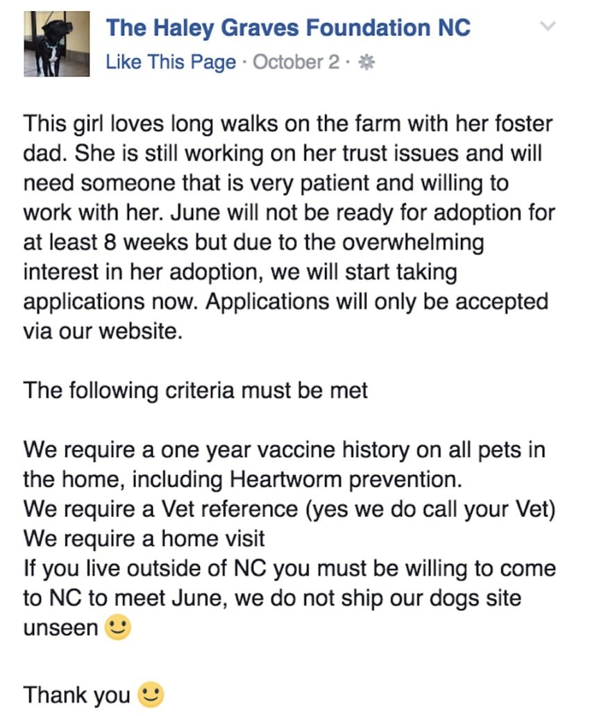 Na tym etapie June została zgłoszona do adopcji. Osoby zainteresowane przyjęciem suczki do stałego domu proszone są o kontakt z The Haley Graves Foundation i wypełnienie formularza adopcyjnego dostępnego u organizacji. Fundacja podkreśla, że idealny dom to taki, który zaoferuje June cierpliwość, stały nadzór medyczny i dużo spokoju na początku wspólnego życia.