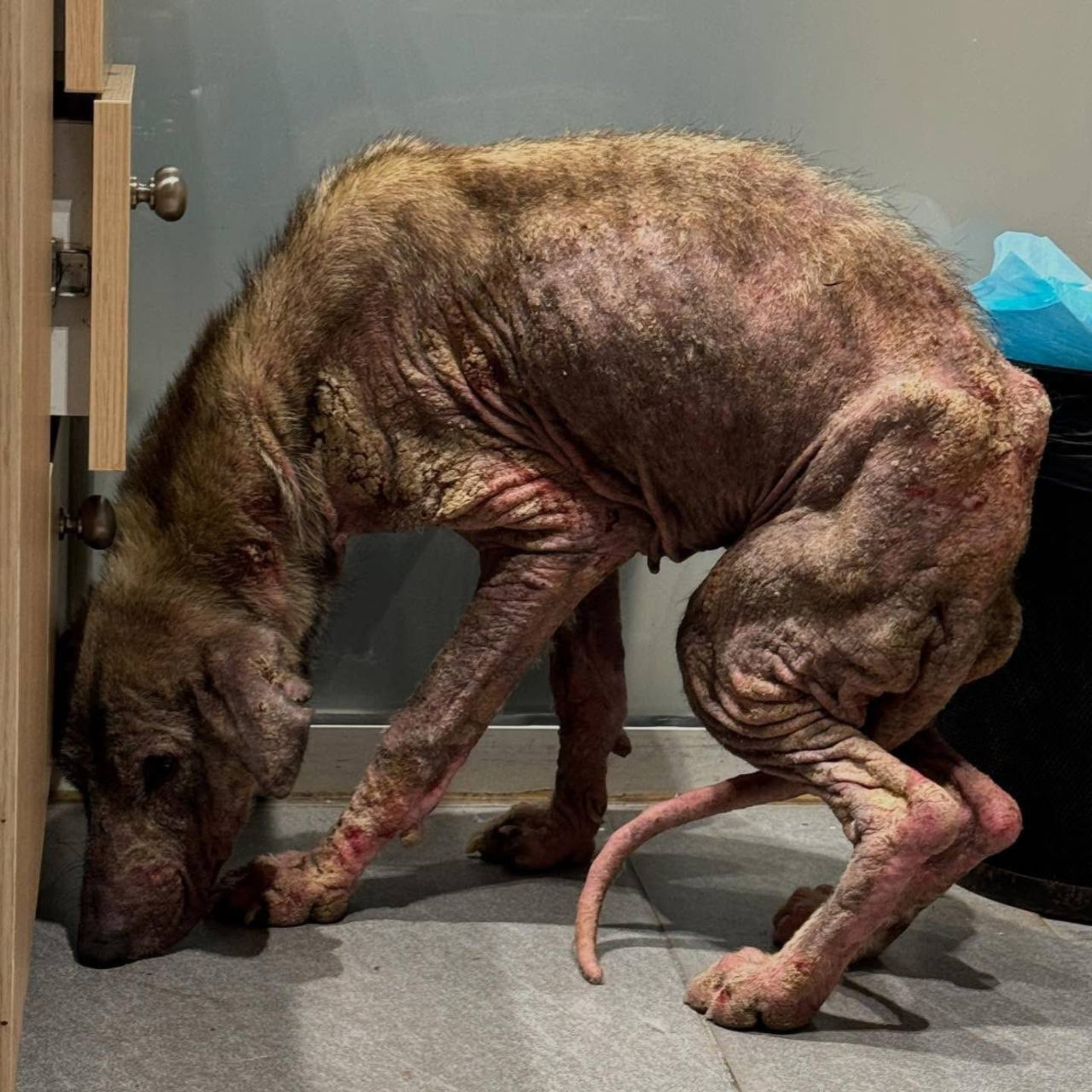 Gdy zobaczyli go zostawionego pod drzwiami, weterynarz Irina podeszła powoli i odkryła karton z psem w środku. Nie było żadnej notatki ani nazwiska; tylko chore ciało i pustka po tym, co było przedtem. Znaleziony był tej samej nocy — ktoś zostawił pudełko z nim przy wejściu. Nie poruszał głową, jedynie ogon osuwał się po kartonie, jakby przepraszał za swoje istnienie.